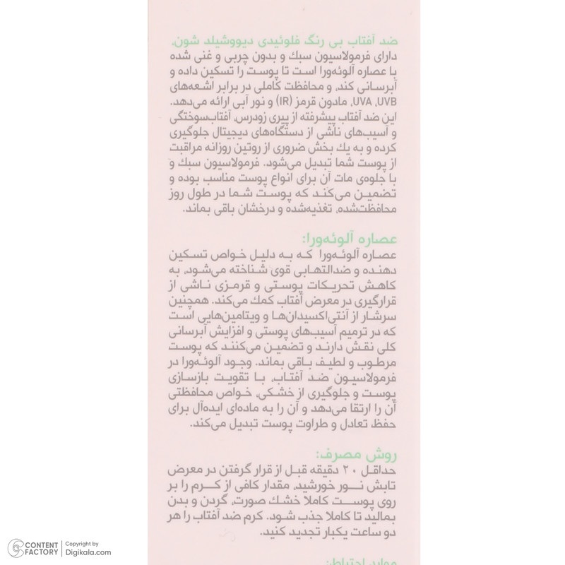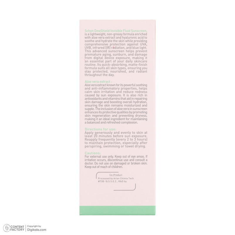 ضد آفتاب بیرنگ فلوئیدی شون محصولی پیشرفته با فرمولاسیونی سبک و بدون چربی است که بهراحتی روی پوست جذب شده و احساس سنگینی ایجاد نمیکند. این ضد آفتاب با بهرهگیری از عصاره آلوئهورا، پوست را عمیقا آبرسانی کرده و با خواص تسکیندهنده خود از تحریکات و قرمزی ناشی از نور خورشید جلوگیری میکند. یکی از ویژگیهای برجسته این محصول، محافظت چندلایه آن در برابر اشعههای مضر UVB، UVA، مادون قرمز و نور آبی است که میتواند از آسیبهای محیطی و پیری زودرس جلوگیری کند.